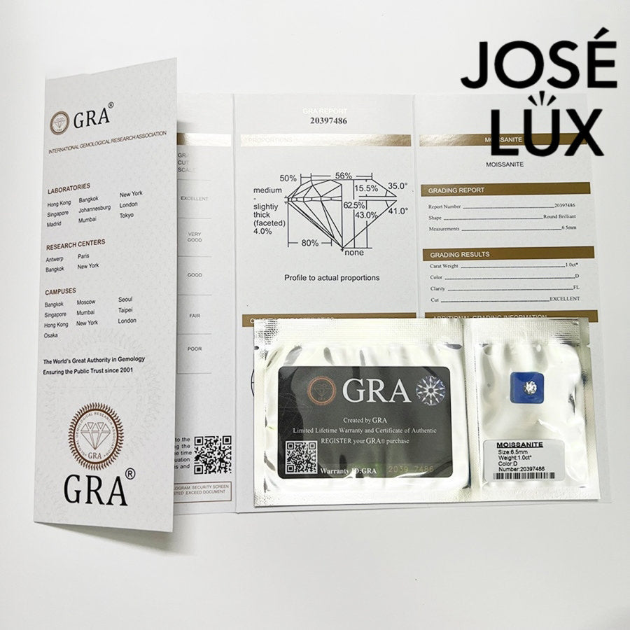 Moissanite jewelry from José Lux includes a GRA certificate verifying the stone's cut quality. We use authentic moissanite stones, each certified by the Gemological Research Association.
