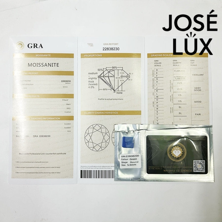 Moissanite jewelry from José Lux includes a GRA certificate verifying the stone's cut quality. We use authentic moissanite stones, each certified by the Gemological Research Association.