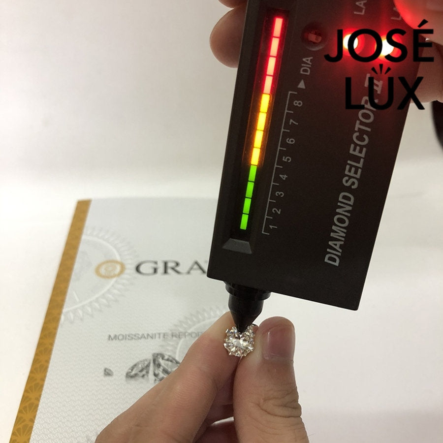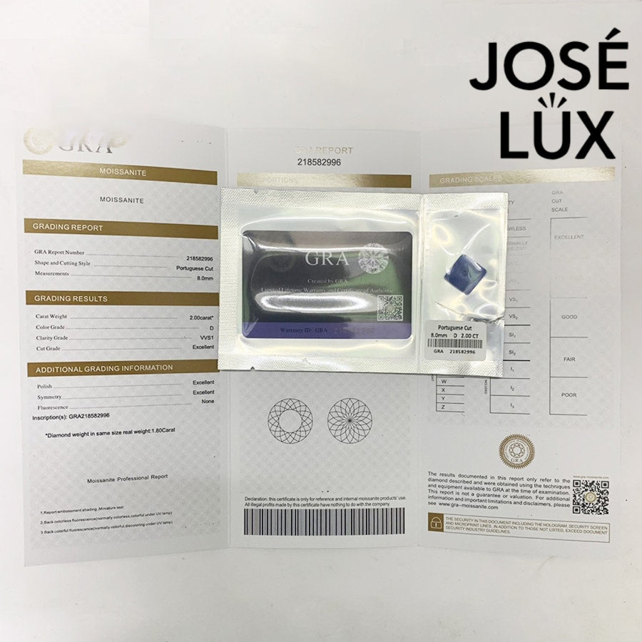 Moissanite jewelry from José Lux includes a GRA certificate verifying the stone's cut quality. We use authentic moissanite stones, each certified by the Gemological Research Association.