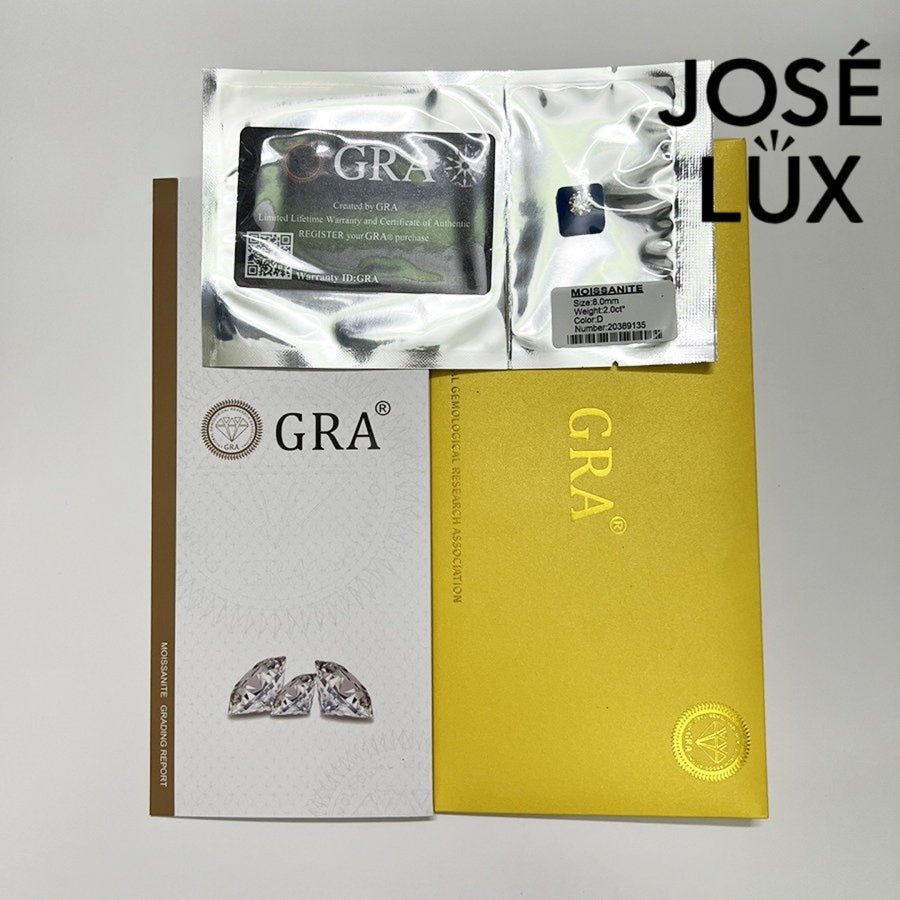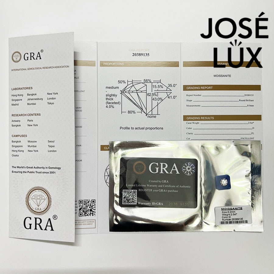 Moissanite jewelry from José Lux includes a GRA certificate verifying the stone's cut quality. We use authentic moissanite stones, each certified by the Gemological Research Association.